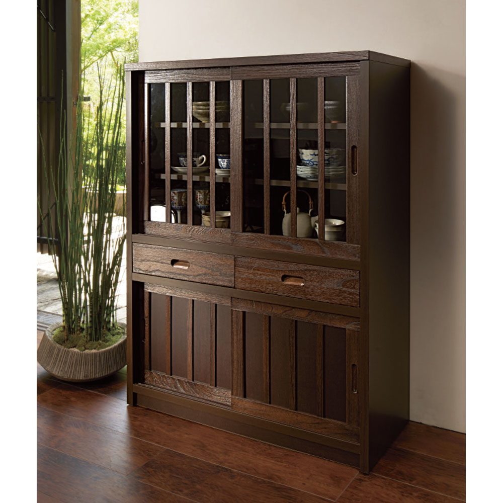 和モダンデザインの美しい木目の質感と格子が際立つ、国産水屋たんすシリーズのダイニングボード。収納力と使い勝手の良さも魅力です。〜立体的な木目の質感と人気の格子デザインがマッチ〜●古民家風デザインがおしゃれな引き戸式食器棚。●格子が美しいガラス扉の収納部は、飾り棚としてもおすすめです。●丈夫な箱組引き出しなど、国産ならではの丁寧なつくりが際立ちます。〜ほどよい高さと使い勝手の良さにもこだわりました〜●収納部は出し入れがしやすく、開閉に場所を取らない引き戸式です。●小物の収納に便利な引き出しが2杯付いています。●盛り付けやちょい置きに便利なスライドテーブル付き。●小柄な方でも最上部に手が届き、圧迫感のないほどよい高さ170cm。〜暮らしに合わせて選べる7タイプ〜●幅、高さ、使用方法などに合わせて選べる7タイプをご用意しました。●古美術や本、CDなどのコレクションを上品に飾ることもできます。●憧れの古民家テイストを取り入れた、素敵なお部屋ができあがります。桐 うづくり仕上げ木の表面を磨きながら削ぎ落として木目に凹凸を付け、年輪が浮き上がった美しい表情に仕上げます。