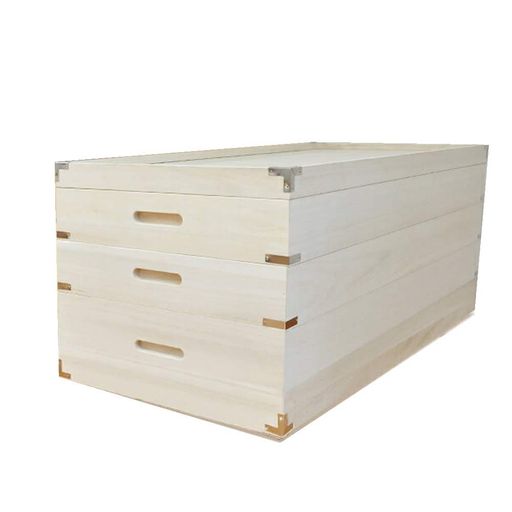 一般的なサイズの和たんすよりも高さと幅を小さくしコンパクトにした、かわいい和たんすになります。たんすの横幅は1m6cm。和たんすでは最小サイズとし、高さも1m40cmと低く抑えました。また、全体の板の厚みは2.7cmの厚い板を使い、四隅を丸くしたシンプルな作りです。(胴厚と呼ばれています)全体は2つに分かれる2重ね。観音開きの中は、「着物」がピッタリしまえる衣装盆が5枚。帯締め・帯揚げなどの小物をしまえる引出しもついています。下3段の引き出しには、内寸15cmの深さで「着物」なら5〜6枚、セーターなどの普段着もゆったりしまえます。観音開きの中の衣装盆は内側・外側・上部も全て丸く加工した丸盆。1枚に「着物」が2〜3枚が収納可能で、衣装盆だけで10〜15枚の「着物」が収納可能です。浅い盆なので重ねずに丁寧に収納できます。