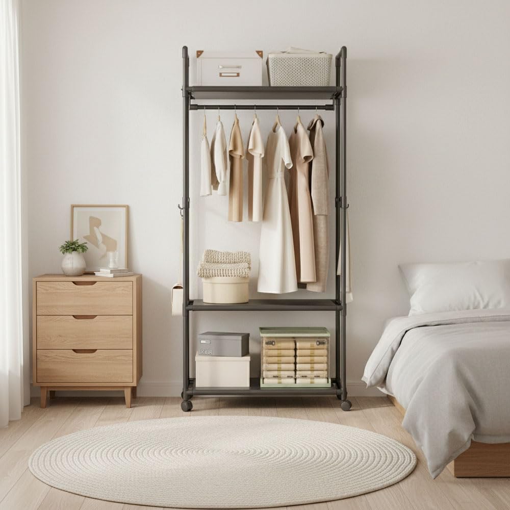 ■IBUYKE ハンガーラック トローリーハンガー ワードローブ 棚 4段 キャスター付き ワゴン 衣類収納 洋服掛け 8つのフック オープンラック