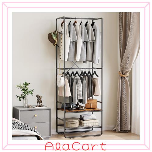 ■ハンガーラック スリム おしゃれ 洋服掛け フック付き 4段棚付き 帽子 組立簡単 衣類 収納ラック 省スペース 多機能 玄関 部屋