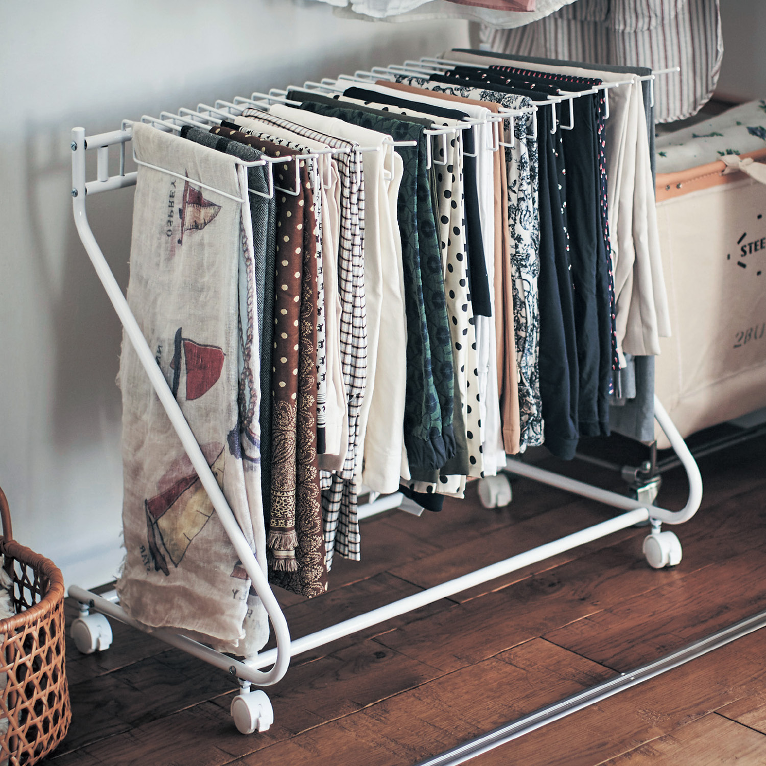 すべりにくい樹脂加工を施したスラックスハンガーバーは、ストールなどを掛けるのにもぴったり片側からパタパタと動かせるのでどれを着るか選びやすいバーごと取り外して、掛けたり取ったりが簡単にできますバーの本数はたっぷり20本クローゼットや押入れ下段の空きスペースを有効活用できます