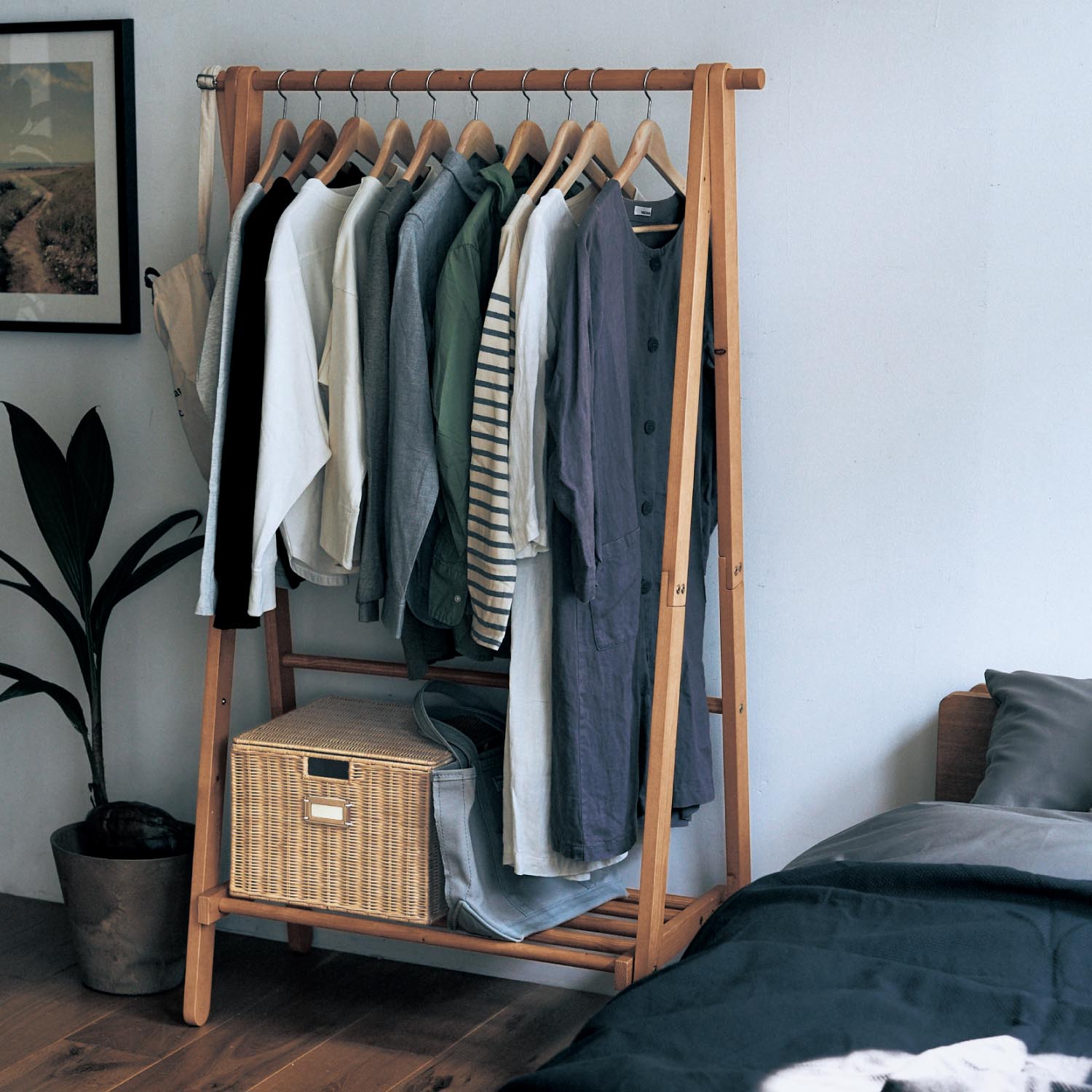 【天然木の頑丈な仕様】インテリア性の高い天然木のハンガーラック素材に厚みをもたせ、ハンガーバーを太くすることでたくさん掛けてもたわみにくい頑丈な仕様足もとの棚はバッグや小物の置き場所に使えますハンガーバーの両サイドはバッグや帽子掛けに便利【お部屋が片付く必須アイテム】服やバッグなどをちょっと掛けておくのに便利ハンガーラックがあれば服や物の床置きが減り、部屋が散らかりにくくなります明日のコーディネートの準備をするのにも役立ちます使わないときは折りたたんでコンパクトにしまえます