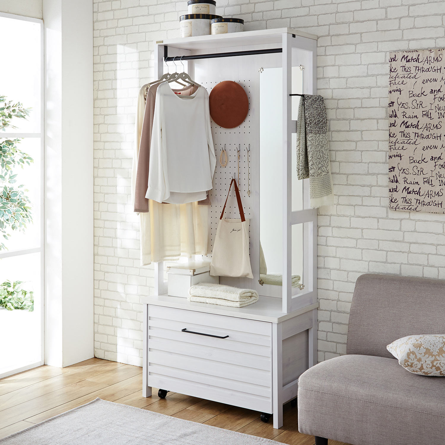 一通りの身支度が整う、ミラー付きのハンガーラック背面はパンチングボード仕様だから、有孔ボード用フックなどでアレンジ可能棚にはよく使うバッグなどを置くのに便利たまにしか使わないけどサッと取り出せる所に置いておきたい・・・そんなアイテムはワゴンに収納OKキャスター付きなので引き出すのもスムーズですストール類を掛けておけるサイドバー付きで収納性抜群統一感のある空間が生まれるシリーズ商品も別売りでご用意しています