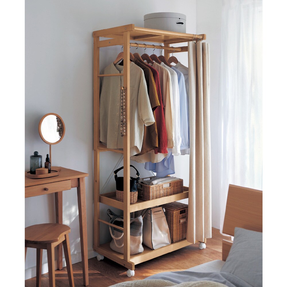木の風合いがやさしいナチュラルなデザインお部屋の雰囲気にも合わせやすいシンプルさ衣類やバッグ、小物類を収納できる棚付きお気に入りをまとめておけば身支度もスムーズお手持ちのカーテンを吊るせるバー付きサイドフックは外側・内側どちらにも付けることができます移動に便利なキャスター付き