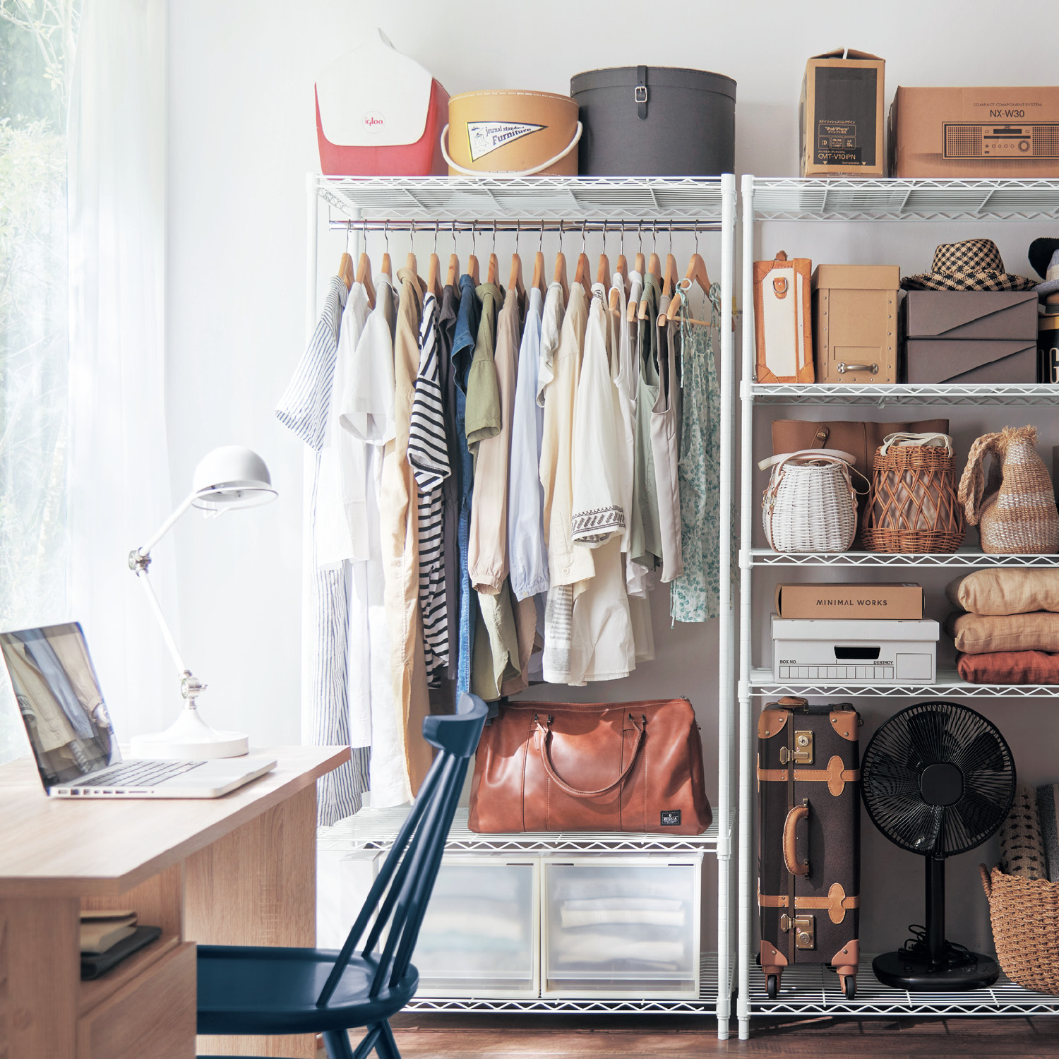 長いコートも掛けられるハンガーバー付き寝室やクローゼット、納戸などで活躍リビングやキッチン、サニタリーなどにもおすすめ棚板は好きな高さに設置できる棚板一枚あたりの耐荷重量が30kgなのでたっぷり収納インテリアに合わせやすいカラー展開お求めやすい価格も魅力