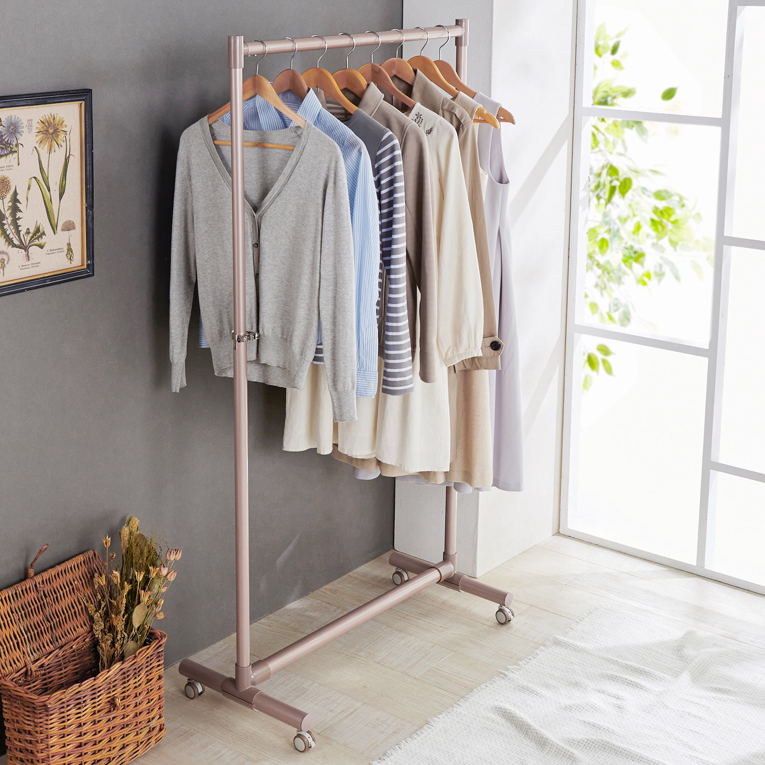 アルミのパイプに光沢のあるカラーで塗装をほどこした、おしゃれなハンガーラック軽くて扱いやすいアルミ製で、パイプが太いので衣類を掛けても安定感がありますレバーで高さ調節ができ、ジャケットから長物の衣類も掛けられますお好みのカラーから選べて、キャスターもお揃いのカラーに統一されているのがポイントキャスターで手軽に移動でき、ストッパーも付いて安定感も◎
