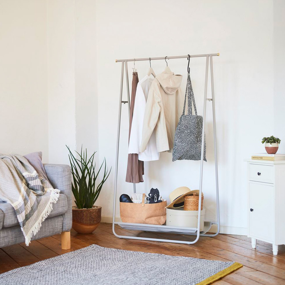 リビングでも寝室でもインテリアになじむ、スリムなハンガーラック。クローゼットだけでは収納が足りない部屋の"ちょい足し収納"にぴったり。バッグや雑貨などの置き場に困るアイテムはファブリックラックにまとめて整頓できるほか、室内物干しとしても使えます。工具不要で、部品を差し込んでいくだけで完成するので組み立て簡単。使わないときは折りたたんで省スペースに収納できます。