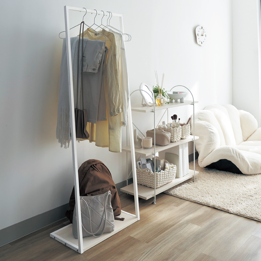 無駄を省いたシンプルさが魅力シンプルでお部屋に合わせやすいデザインとカラーに仕上げました角パイプのフレームは艶消し塗装だから主張せず、どんな空間にもマッチします高さをいかして丈の長いコートも掛けられるバッグなどを置くのに便利な底板付き玄関でアウター掛けのハンガーラックとしても◎シンプルな構造なので組み立ても簡単!