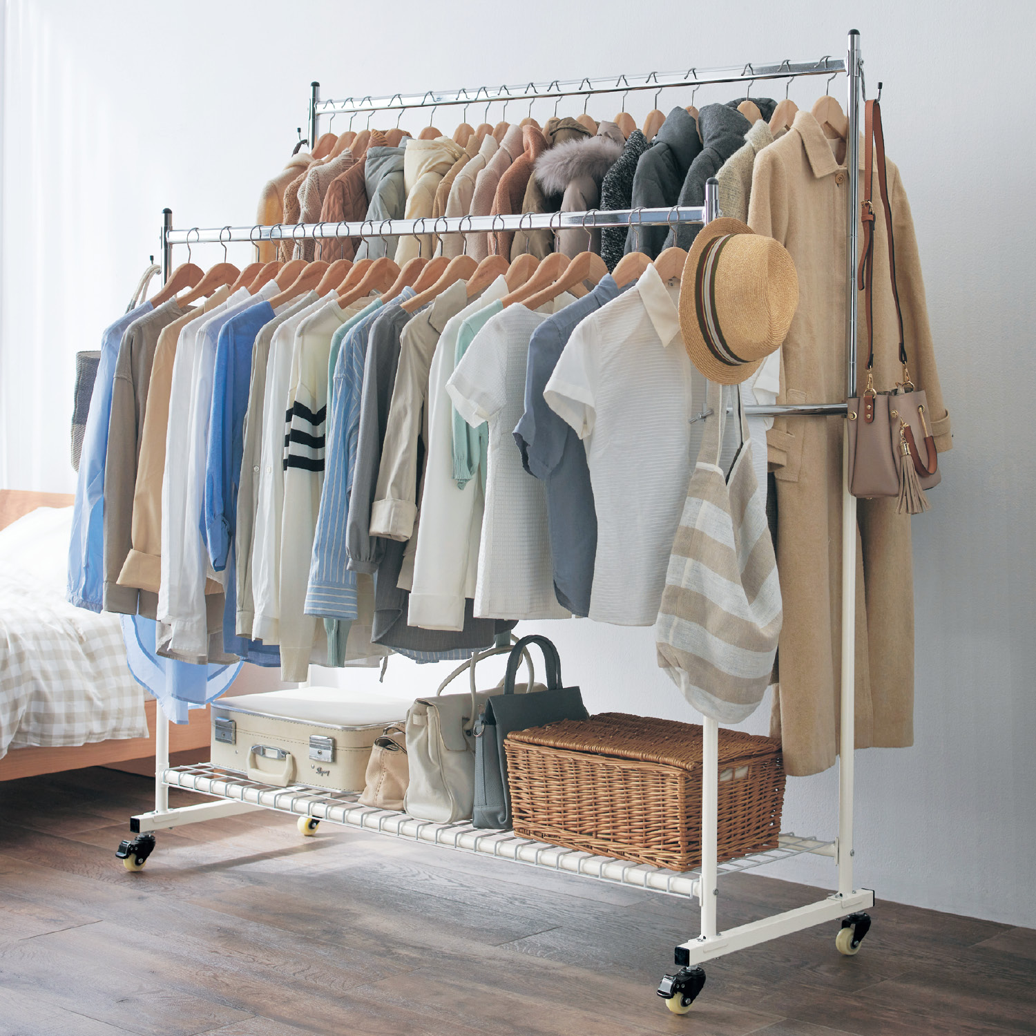 高さ202cmのハイタイプハンガーバーはたっぷり掛けられる耐荷重40kgシングルタイプは丈の長いコートなどが掛けられるダブルタイプは上下で大量に掛けたい方に底板がないからスーツケースや収納アイテムが置きやすい衣類ケースを組合わせても◎空き部屋をウォークインクローゼット風に使えて便利