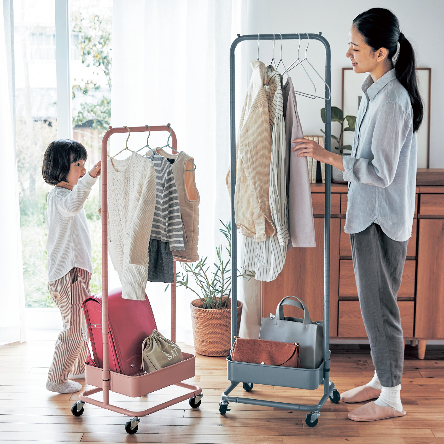 工具不要で女性でも組み立て簡単ワンルームのお部屋にも置きやすいスリムデザインのハンガーラックしっかりとした高さがあるのでコートなどの長物もOK下部のバスケット部分にはカバンなどを置くのに重宝しますバスケット底面は細かいメッシュ仕様で、ピアスなど小さな物を落としても安心組み立て時にバーの部分を低くすれば、お子様用としてもお使いいただけますストッパー付きキャスターで固定も移動もOKインテリアに合わせて選べる6色をご用意今風のお部屋にも馴染むスモーキーなカラーもラインナップしていますシリーズの4段シェルフと揃えて使うのもおすすめです