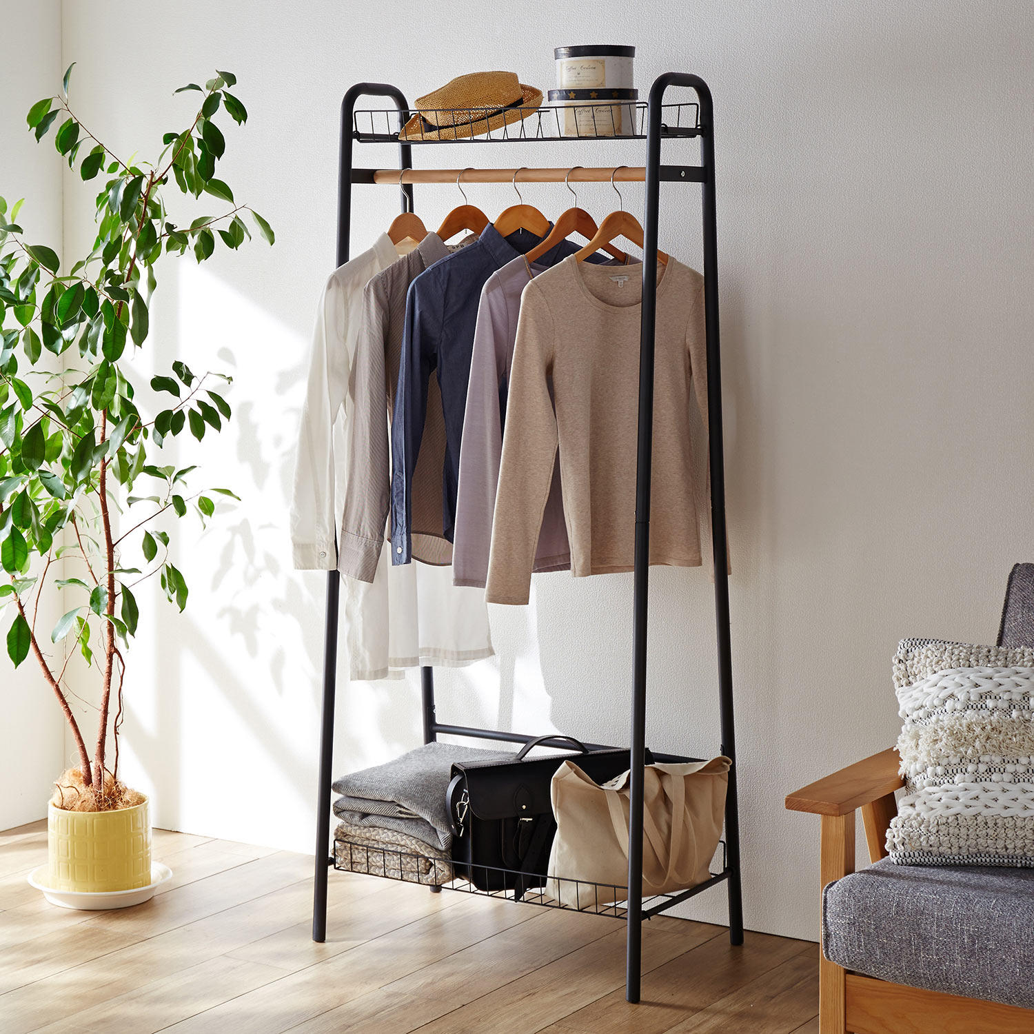 ショップディスプレイのような収納を楽しめるハンガーラック上下段にメッシュ棚を備え、帽子や小物、収納ボックスを置くのに大活躍掛ける収納に便利なハンガーバーは天然木でさりげないナチュラルさをプラス高さがあるのでコート類も収納OK抜け感のあるすっきりとした佇まいはワンルームのお部屋にもおすすめです