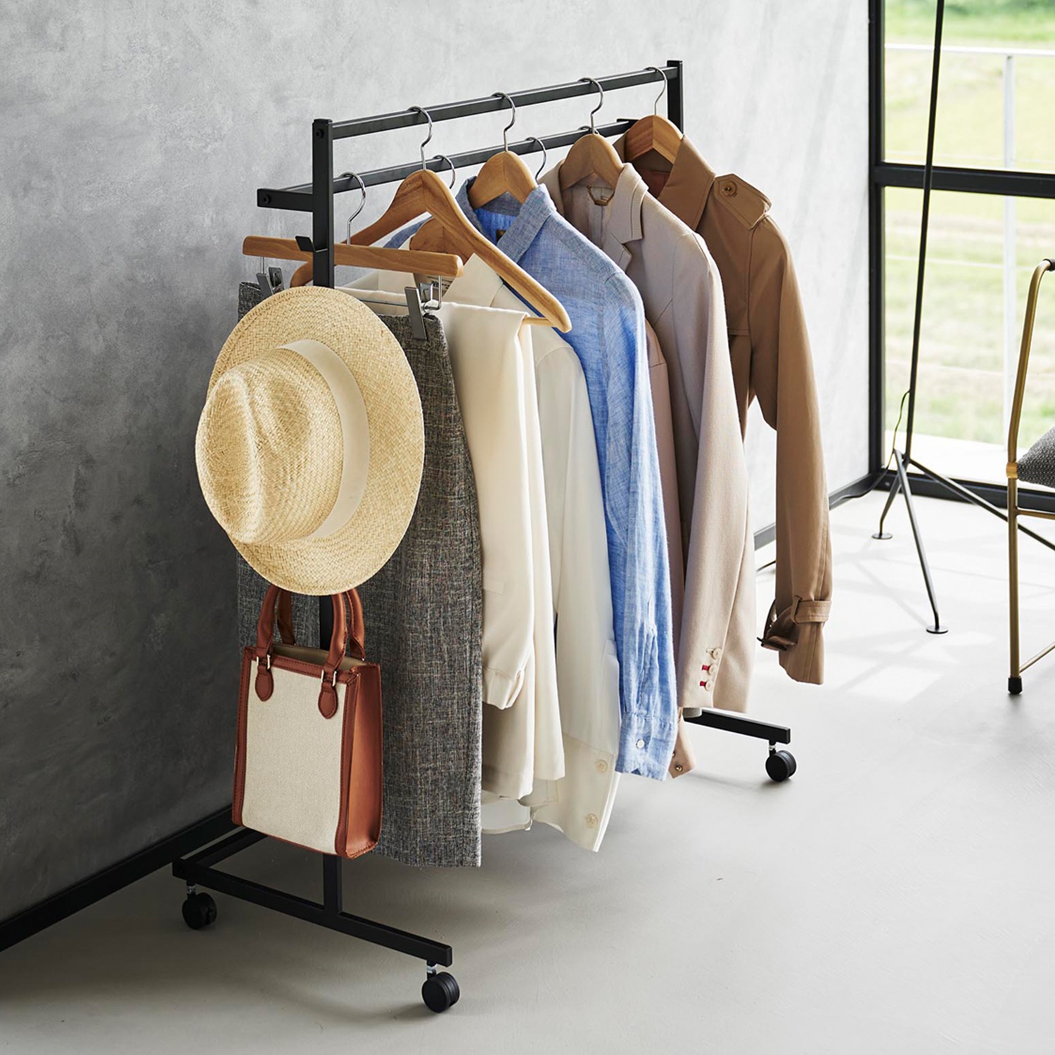 上下にハンガーバーを備えた、たっぷり収納できる幅伸縮式のクローゼットハンガー長物を掛けられるハンガーバーは伸縮でき、収納量に合わせて調節することができます天板上には衣類ボックスを置け、使い勝手は抜群サイドバーにもストールやベルトなどの小物を掛けられる、シンプルながらも収納性のあるつくりになっています片側のみキャスターが付いているので、移動もスムーズ