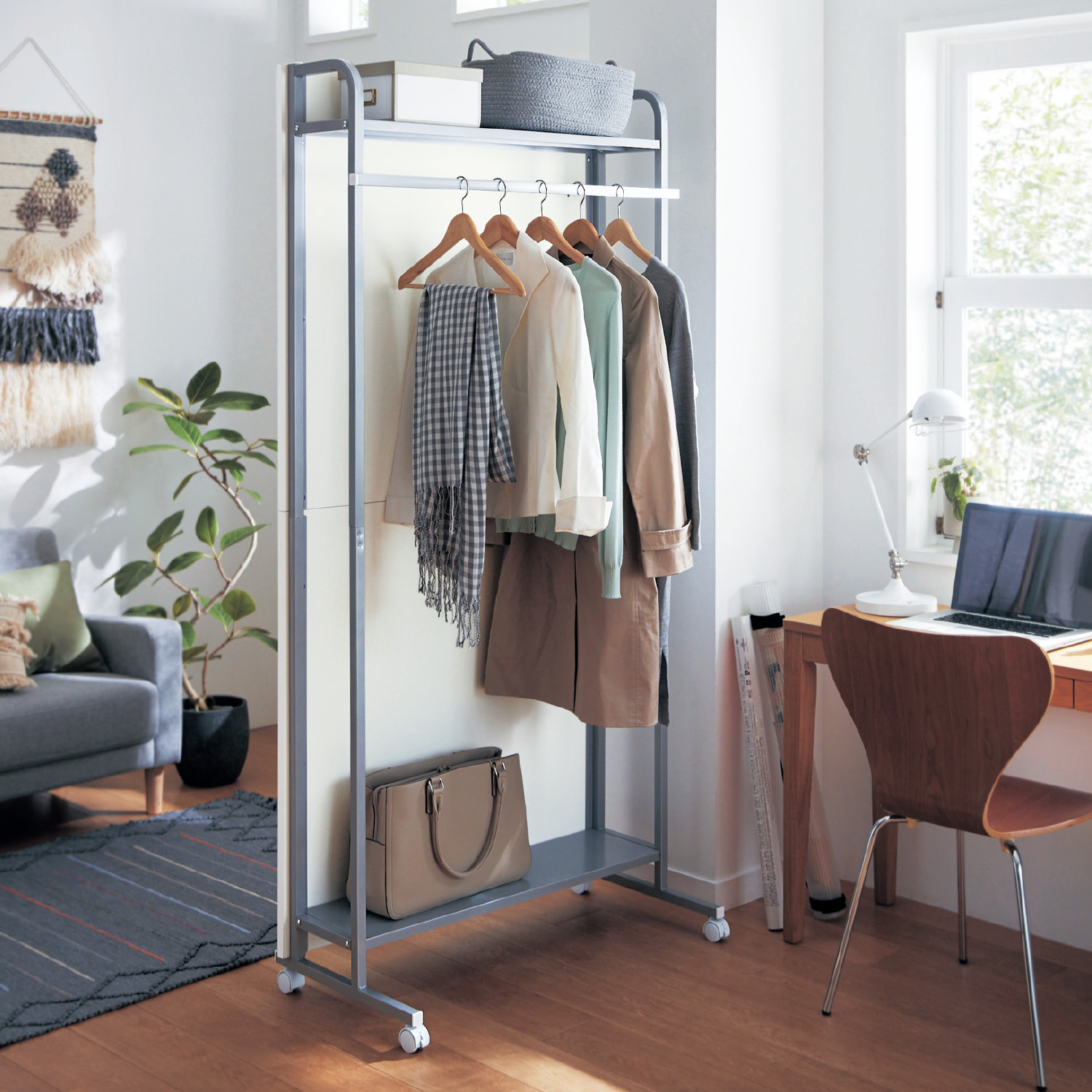 上下にハンガーバーを備えた、たっぷり収納できる幅伸縮式のクローゼットハンガー長物を掛けられるハンガーバーは伸縮でき、収納量に合わせて調節することができます天板上には衣類ボックスを置け、使い勝手は抜群サイドバーにもストールやベルトなどの小物を掛けられる、シンプルながらも収納性のあるつくりになっています片側のみキャスターが付いているので、移動もスムーズ