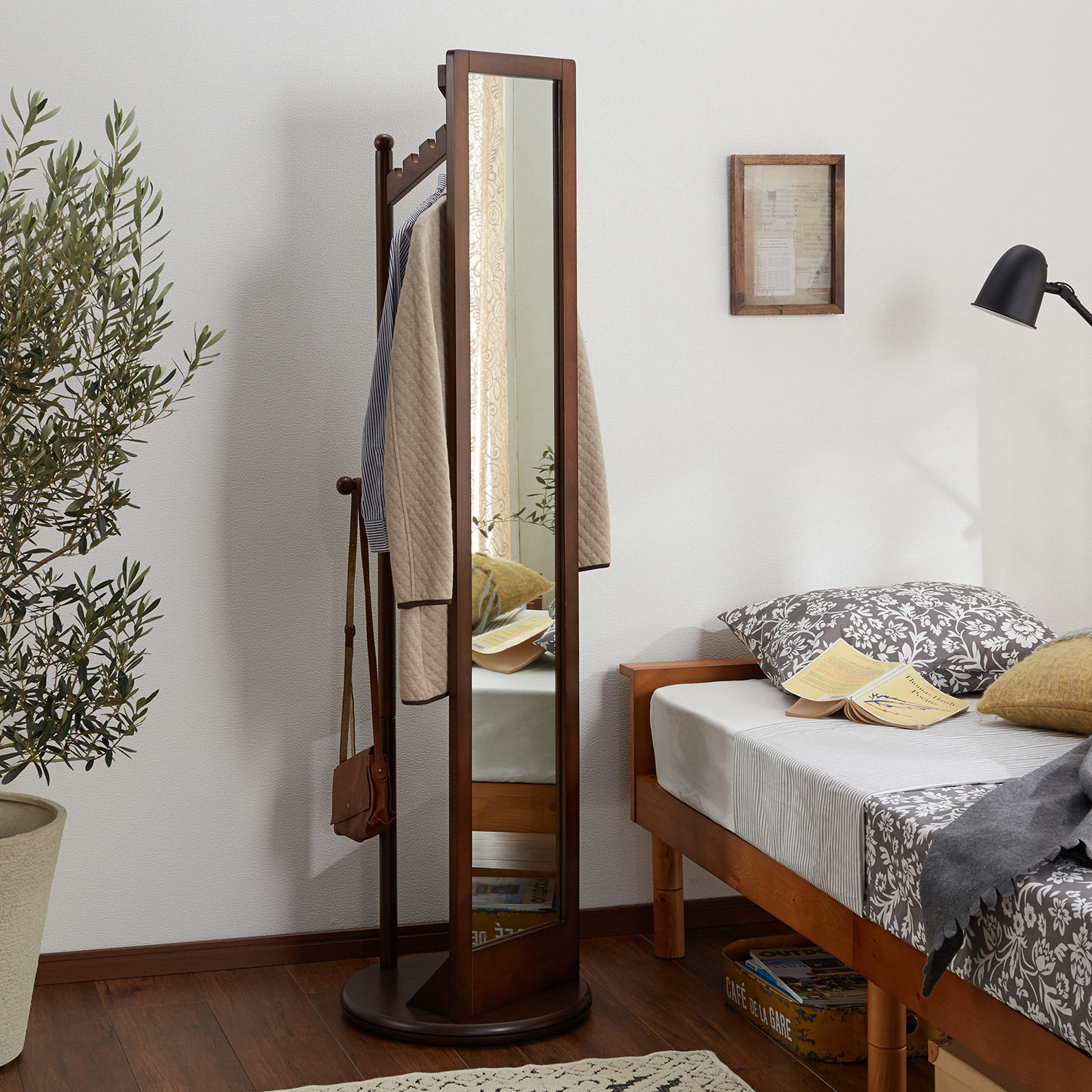 360度クルクル回る、姿見のミラーが付いた便利でユニークな回転ハンガーラックミラーの後ろには6個のハンガーが掛かるハンガーバーと、バッグやベルトが掛けられる3つのフックが付いています高さがあるので、ワンピースも裾が床に着かずに掛けられて便利普段はミラーを表にするもよし、お気に入りの服を掛けたハンガーを表にするもよしお出かけ前のコーディネートと、全身チェックはこれで万全天然木の風合いと、選べるナチュラルな3カラーが、インテリアにやさしくなじみます#全身鏡#全身ミラー#姿見鏡#姿見ミラー