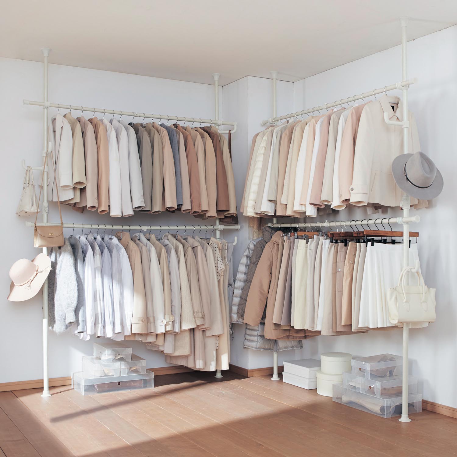 この1台で大容量の収納が叶うクローゼットハンガーラック幅伸縮できるので設置したいスペースを余すことなく活用できますリフォームなどの施工不要、組立て設置するだけで空き部屋がウォークインクローゼットにハンガーバーは高さがあるのでロングコートなどもすっきり掛けられますハンガーバー下のオープン部に衣類チェストなどを設置すればさらに収納力アップ上部の棚も幅に合わせて伸縮するのでバッグや季節ものの収納にベッドやデスクをまたいで設置することで、デッドスペースになりがちなスペースを有効活用することができます組立て式なので、お引越しや模様替えの際も安心です