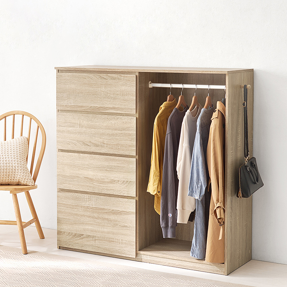洋服や小物をまとめて収納できる多機能ハンガーラック幅121cmのワイドサイズで大容量収納高さ120cmのハンガーポールで、ハーフコートもしっかり掛けられます大小の引き出し付きで、衣類から小物まで多彩な収納が可能大引き出しは深さ約27cmでブランケットの収納や化粧品のストックなどに最適バッグや小物を掛けられるサイドフック付き天板は自由に使えるスペースなので、ディスプレイやドレッサー代わりにもハンガーポールを外せばキャンプ用品など背の高い物も収納可能。お部屋や用途に合わせてアレンジできますインテリアに合わせて選べる3色展開#白系チェスト #タンス #たんす #整理タンス #洋服タンス #コートハンガーラック
