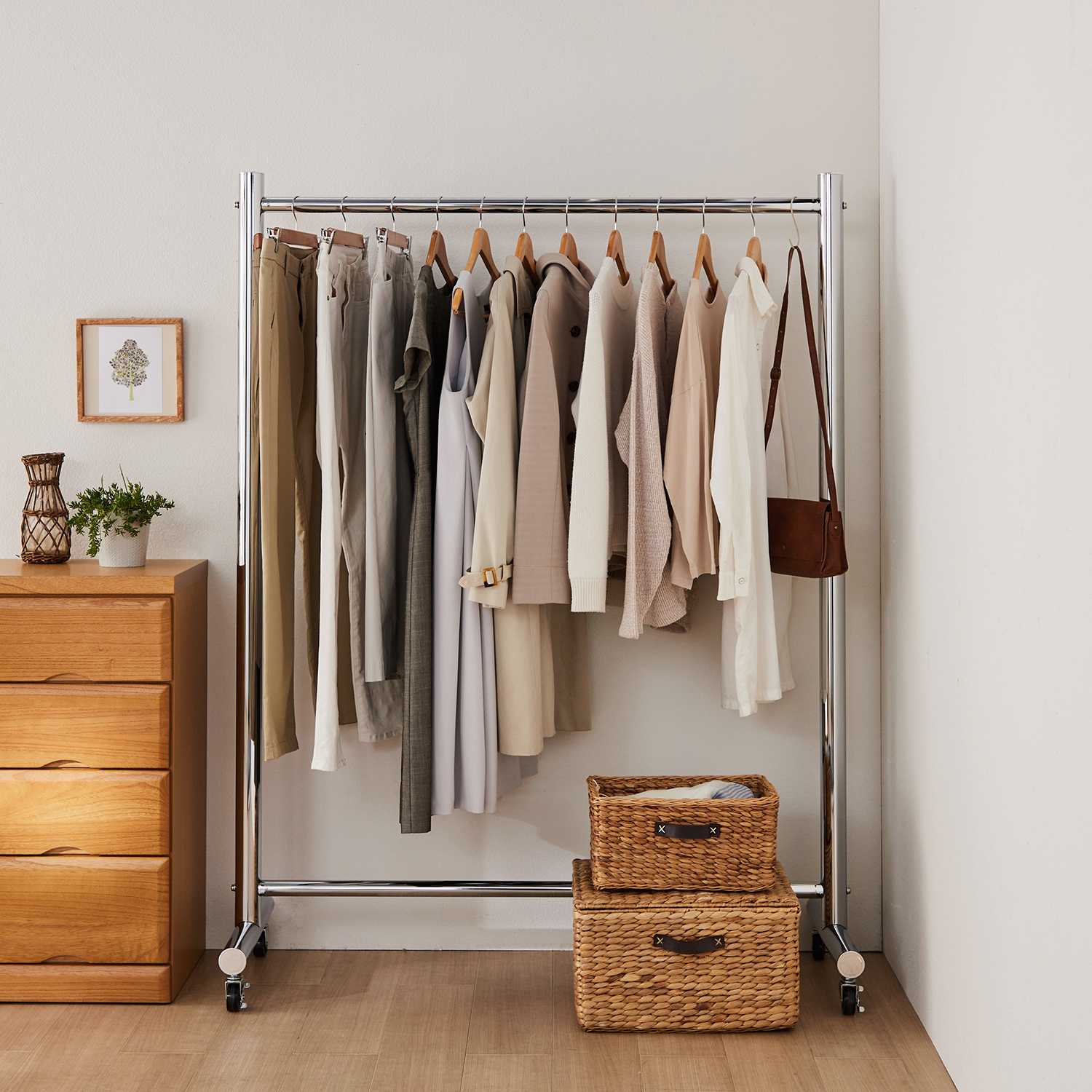 アルミのパイプに光沢のあるカラーで塗装をほどこした、おしゃれなハンガーラック軽くて扱いやすいアルミ製で、パイプが太いので衣類を掛けても安定感がありますレバーで高さ調節ができ、ジャケットから長物の衣類も掛けられますお好みのカラーから選べて、キャスターもお揃いのカラーに統一されているのがポイントキャスターで手軽に移動でき、ストッパーも付いて安定感も◎