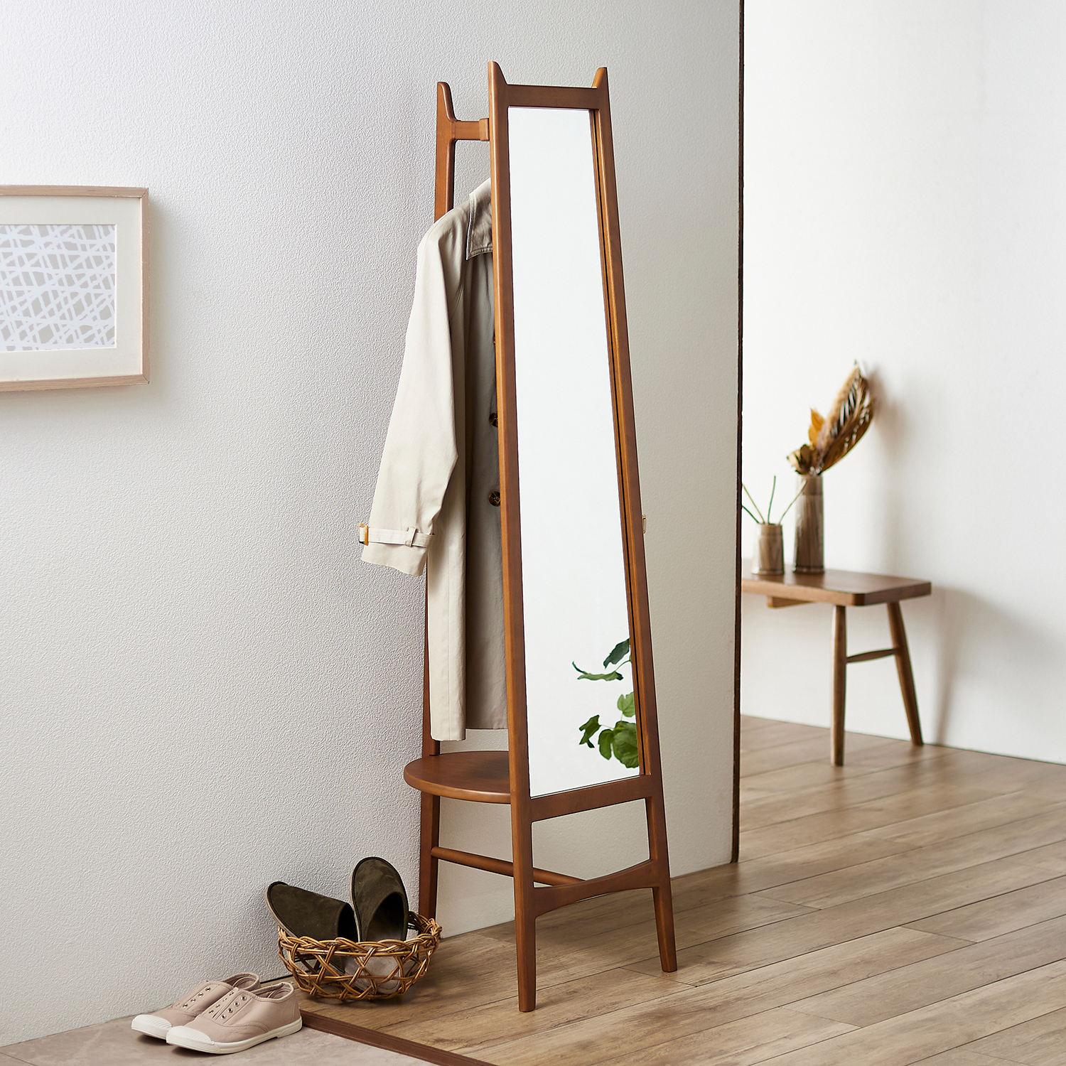 リビングや玄関など、人目につくところに置いておきたいおしゃれなデザイン天然木と丸みのある形状がインテリアに馴染みますミラーとハンガーラックが一体になった省スペースな便利アイテム姿見付きなのでお出かけ前の準備スペースにぴったりフレーム部分に突起があるのでバッグや帽子を掛けられます棚板付きなのでかばんや小物置き場としても◎3本脚構造で、お部屋のコーナーにも設置しやすいデザインです