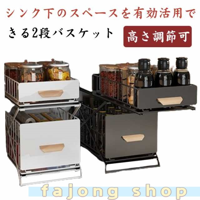 ■シンク下収納バスケット ラック 折りたたみ スライド 2段 引き出し ストッカー 収納棚 スパイスボトル 組み立て不要 高さ調整可 シンク下