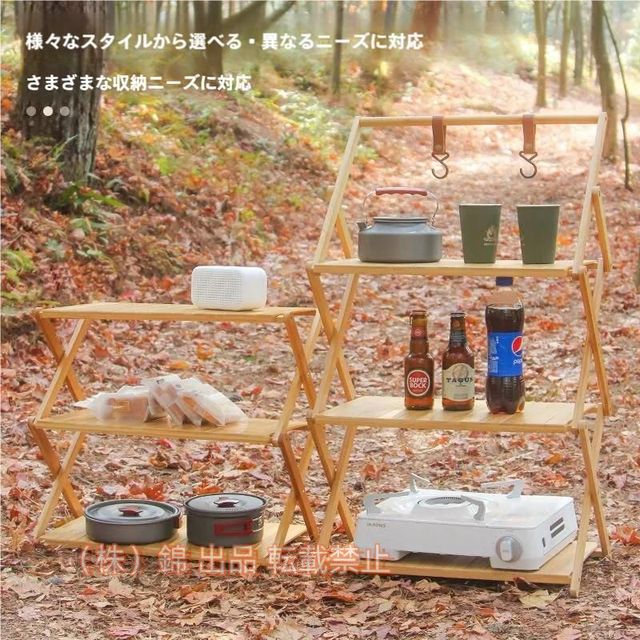 収納バック付き♪キャンプ道具がすっきり片付く折りたたみ式3段ラック♪■エコ素材で話題の竹素材を採用!すっきしりたデザイン!細かい竹の目が美しく、高級感のある質感で贅沢な仕上がり。従来のスカスカの木材のデザインと違い、目が詰まっているので間から物が落ちたりしません。木材よりも強度が高く、長持ちするため、キャンプやお部屋のインテリア、収納など日常使いにもピッタリです。■お洒落な取付フック2個付き♪3段の棚板に加え、引っかけ収納に便利な上部のポール部分のデザイン。そこに取り付けて使用できる、専用フック2個付属します!フックのデザインにもこだわり、竹との相性抜群♪1台あると助かる、使い勝手のいい収納アイテムです。■専用収納バッグ付き♪持ち運ぶときに便利な収納バッグを付属しています。シンプルに男女問わず使いやすいオリジナルデザインです。■軽量&折りたたみ式で便利♪ちょうどいい3段収納!使いたい時にサッと取り出して使える手軽さも魅力。軽量で組み立てやすいため、どなたでも簡単に扱うことができます。