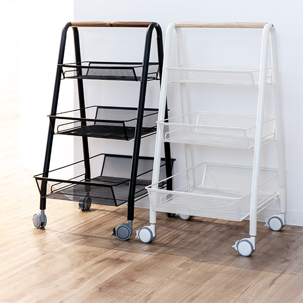 ■ワイヤー バスケット Aライン ラック 3段 キャリーバスケット キャスター付き ( 黒 白 アイアン 木製 キッチンワゴン 収納 ワゴン ホワ