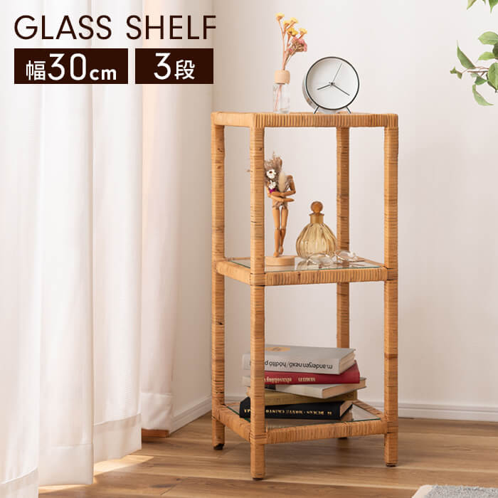 ■【値下げ】オープンラック 3段 幅30cm スリム ラタン ガラスシェルフ 天然 強化ガラス 籐 収納棚 ラック シェルフ 飾り棚 ディスプレイ