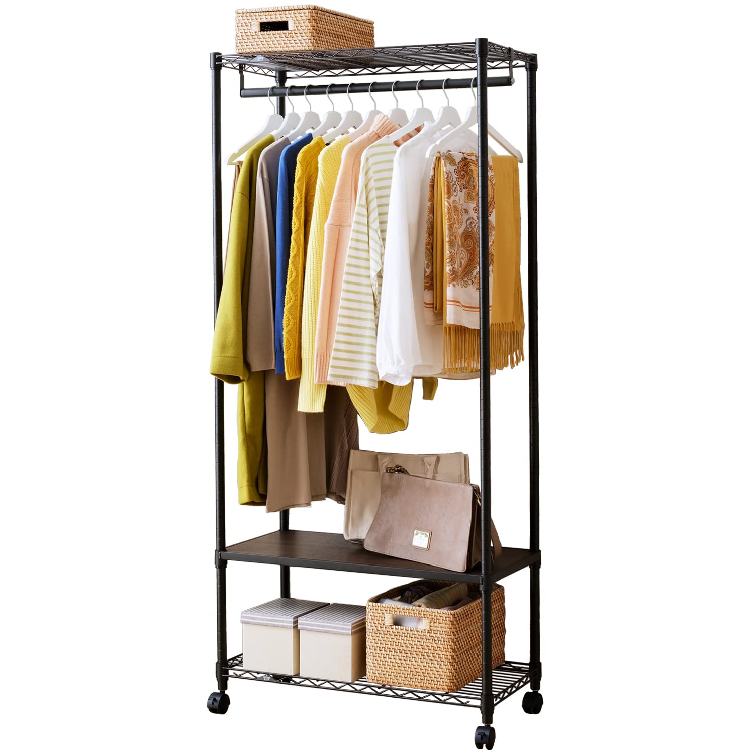 [ドウシシャ] ルミナス ノワール ウッドシェルフ付きワードローブ 3段 幅81 奥行41 キャスター付き スチール シェルフ 棚 収納 ラック コートハンガー 洋服掛け 衣類 スリム オープン 省スペース 頑丈 黒 ブラック おしゃれ 幅81×奥行41×高さ178cm ポール径25mm 耐荷重80kg