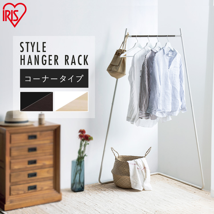 ありそうで無かった、このデザイン!デッドスペースになりがちな、コーナースペースを有効活用。部屋の角にスッキリ収まります。一般的なハンガーラックに比べて、省スペース設計。ワンルームにもおススメです。ついつい、カーテンレールやソファに服を掛けたり、角に寄せてしまう荷物を、「掛けて」「置いて」すっきり。ジャケットもシャツもサッと掛けられる余裕の耐荷重。ロングコートやワンピースもシワにならない高さ。ハンガーの下には靴やバッグなどが置けます。ハンガーバーは柔らかな木目調。パイプはマットな美しいパウダーコーティング。キズ・サビに強い塗装です。約2.33kgと持ち運びもかんたん。(アイリスオーヤマ)