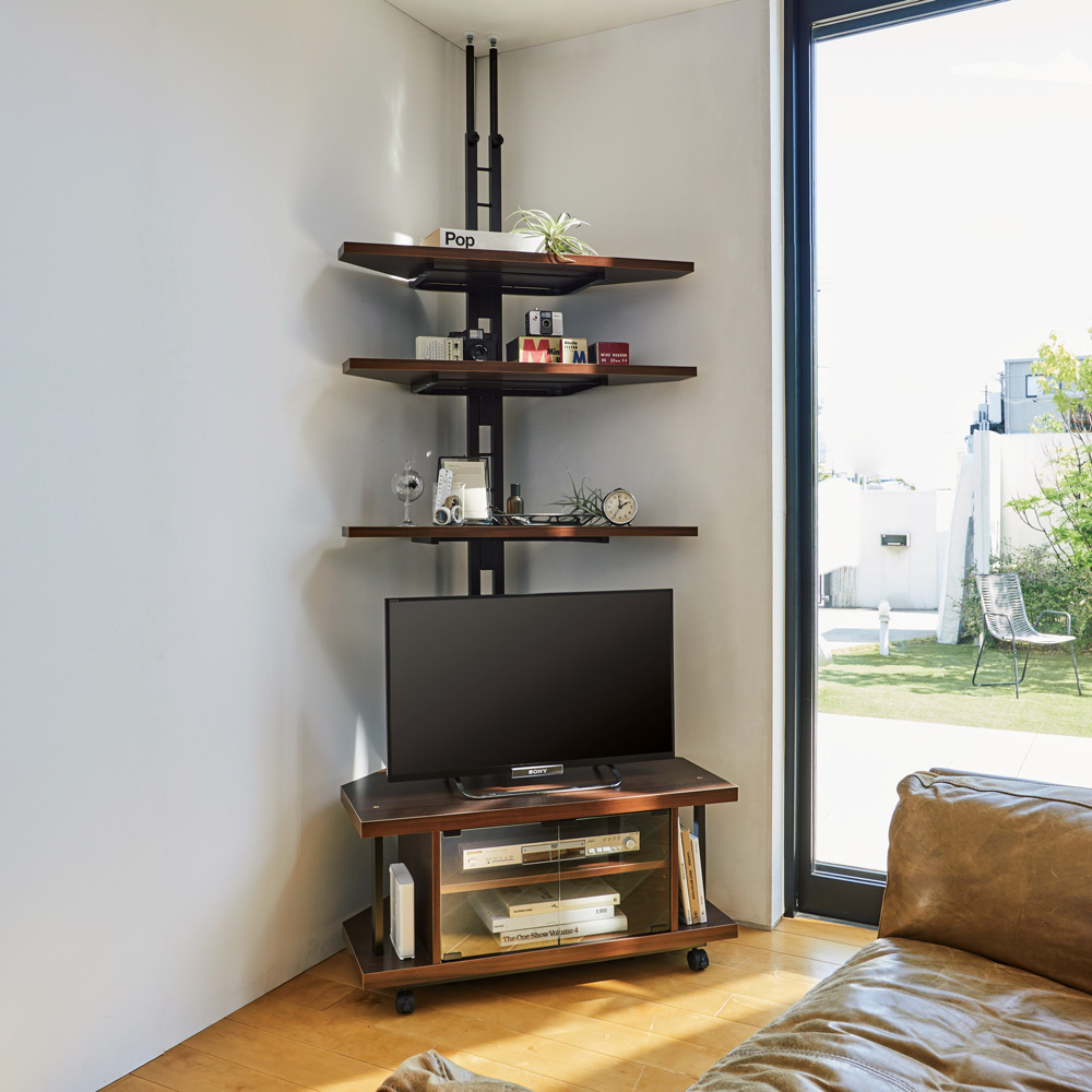 デッドスペースを有効活用できるコーナーラック。テレビ上の空間が収納スペースに!薄型液晶大型テレビの上、リビングボード上の空間を上手に使えばお洒落な飾り棚に早変わりするつっぱりラック。