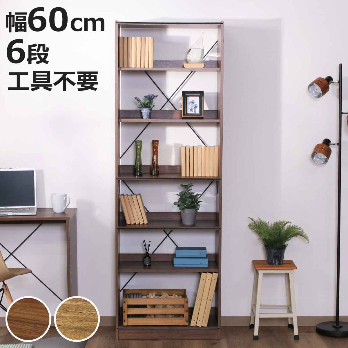 ■EZBO オープンラック 幅60cm 6段 可動棚 工具不要 ( ラック 本棚 収納 ディスプレイ 木目調 背面化粧 イジボ 組立簡単 A4 リビング 棚