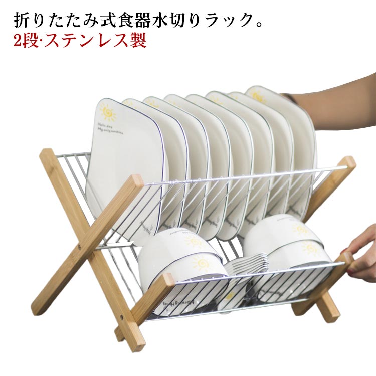 ■水切りラック 2段 折りたたみ スリム ステンレス 竹製 皿立て お皿 茶碗 食器 水切り ラック 食器棚 台所 食器収納 棚 大容量 折り畳み