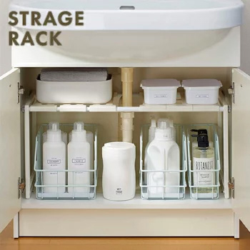 洗面下をスッキリ収納! 排水トラップを避けて設置が出来る「伸縮タイプ」の棚です。 棚の高さも調節できます。 組立も簡単で、工具不要です! キッチンでも使えます。 サイズ(約) 500〜750×303×307(mm) 材質 フレーム=PS、棚板・メネジ=PP パイプ=スチール(PPコーティング)(樹脂部=ABS) 耐荷重 5kg