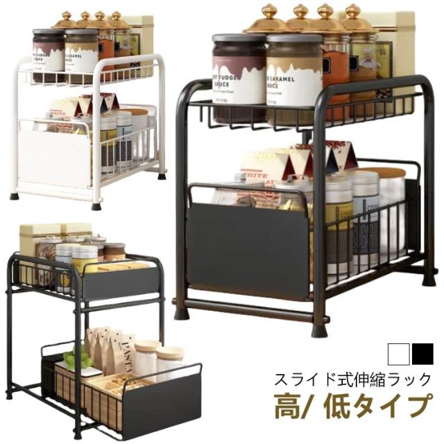 シンク下収納 スライド式 伸縮 ラック 収納 ラック ホワイト キッチン下 引き出し キッチン収納 スライドラック 台所収納 収納棚 ブラック シンプル シンク下スライドラック 多機能 調味料 洗面台下 ボトルラック シンク下収納 収納
