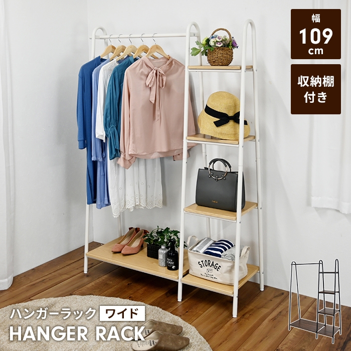 ■【値下げ】ハンガーラック 棚付き 幅109 高さ160 ワイド 衣類収納 スチールラック コートハンガー フック付き ディスプレイ クローゼット