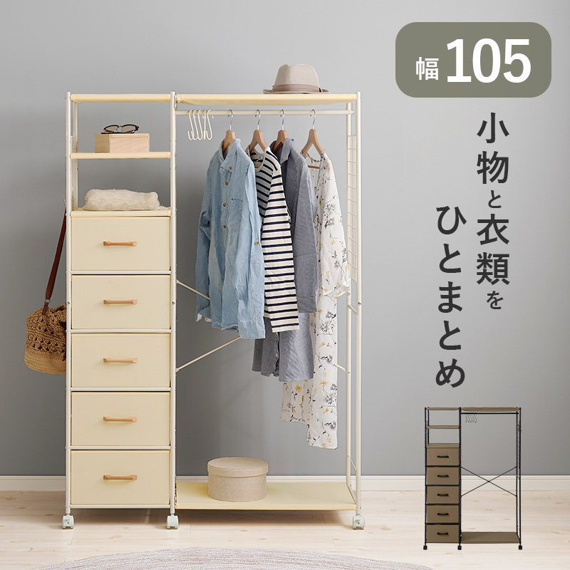 ハンガー収納も引出し収納も1カ所に。ワンピースやコート、小物類もまとめて収納できます。キャスター付きで移動も楽々
