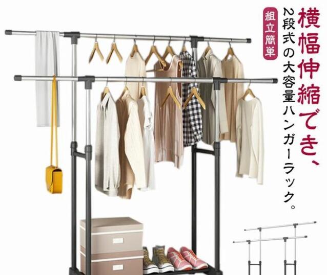 ■ハンガーラック 2段 ダブル コートハンガー パイプハンガー 頑丈 高耐荷重 大容量 伸縮式 キャスター付き スリム 省スペース 子供 コート