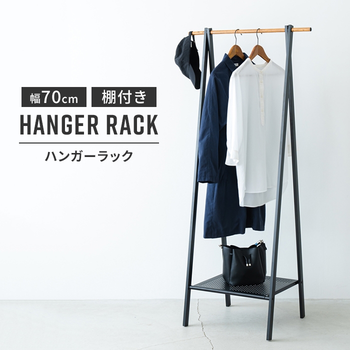 フレームは安定感のある三角設計に、落ち着きのあるマットな質感。木を思わせるハンガーバーとフックは、スチールにリアルな木目柄を施しました。オープンタイプで開放的な空間に仕上げます。パンチング模様が施された収納棚にはお気に入りのバックや靴を置いて自分だけのディスプレイも楽しんでいただけます。棚板の片面を取り外して折りたたんで収納できるので、引っ越しや模様替えのときにも便利。掛けて置いて無駄がない機能とスタイリッシュなデザインを兼ねそなえたハンガーラック、すっきり整頓された快適なお部屋をお作りいただけます。【キーワード】コートハンガー 棚付き ハンガーラック コンパクト 折りたたみ 幅70 省スペース おしゃれ 洋服掛け おしゃれ家具 木目 スチール スリム 組立式 シンプル 衣類 収納 スペース オープン 棚付 空間 服 帽子 カバン