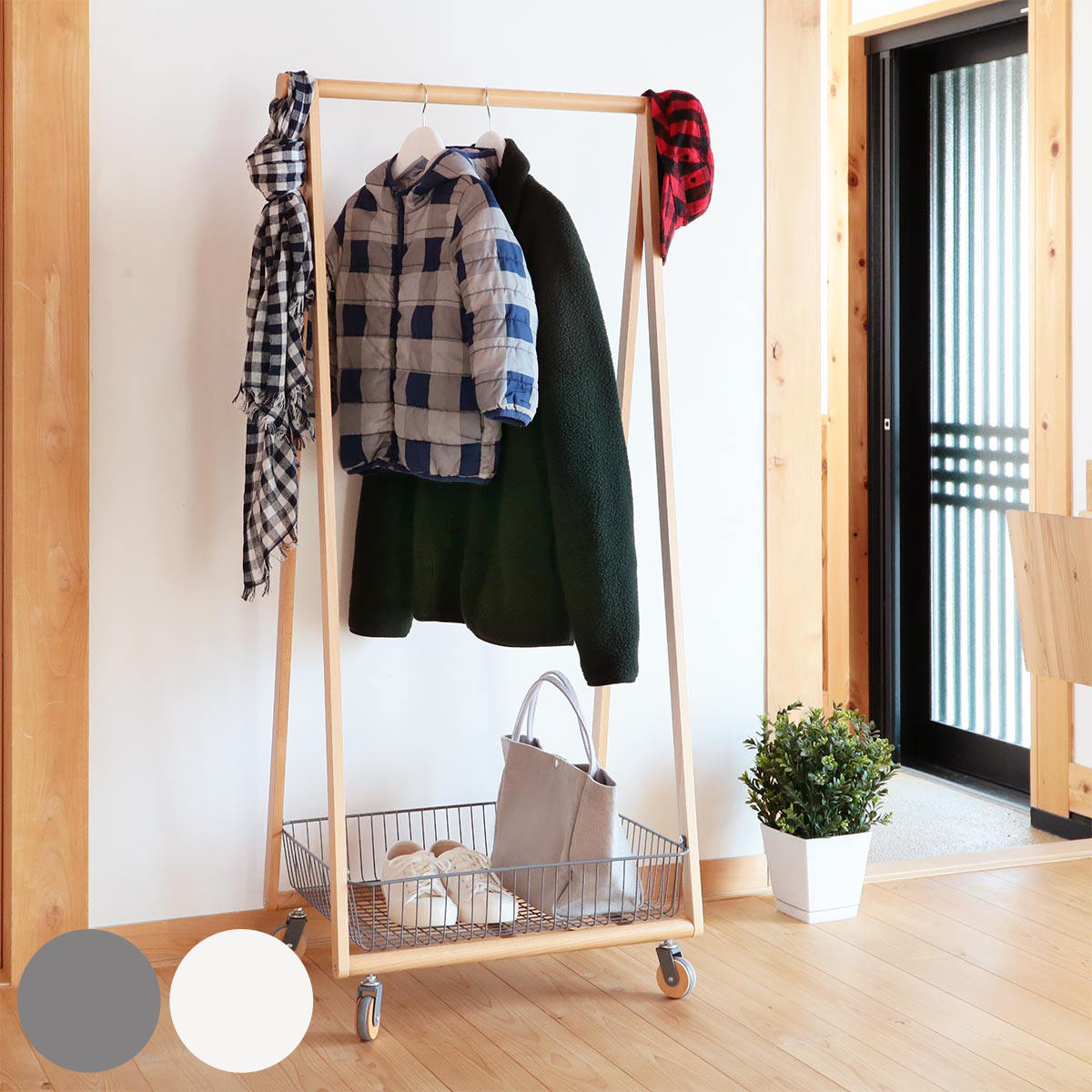 ■コートハンガー 北欧風 天然木フレーム カゴ付 LIV 幅66cm ( リヴ 木製ハンガーラック キャスター付き 収納付き 洋服掛け 木製 ラック