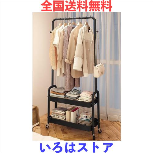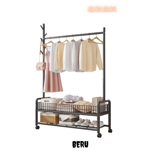 ■ハンガーラック キャスター付き コートハンガー バスケット 棚付き 洋服掛け コート掛け 収納 多機能 大容量 組立品 ブラック 幅90×奥行