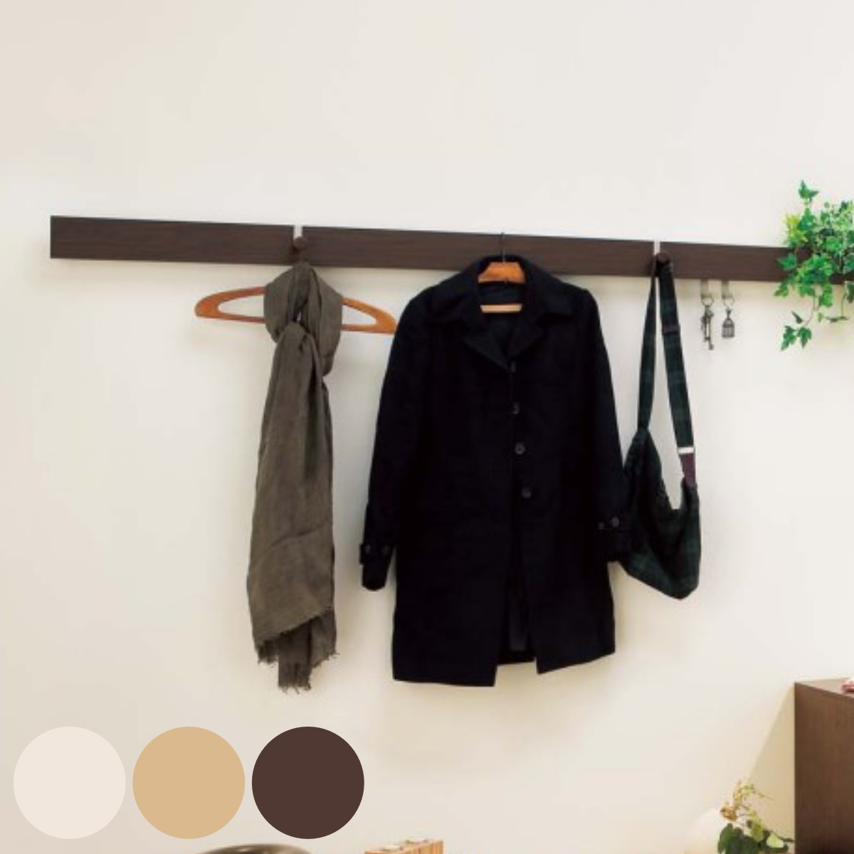 コートハンガーや帽子掛けとしてなど、壁面を収納スペースに変えてくれるアニマルフック。省スペースな玄関や廊下に設置できる手軽さも◎。洋服やストールなど、コーディネート収納も。