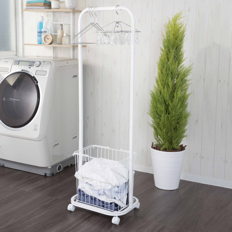 ■特徴かさばるハンガーをこれ1台にたっぷり収納できます。洗濯物をその場でハンガーに掛けられるので、作業もスムーズに。キャスター付きなので、お掃除の時は簡単に移動できます。■サイズ本体:幅43.5×奥行34×高さ140cmバスケット外寸:幅38×奥行28.5×深さ36cm■材質フレーム:スチール(粉体塗装)棚板:強化紙化粧繊維版■重量5kg■耐荷重ハンガー部:約4kgバスケット 部:約4kg■組み立て仕様組立式(約30分)