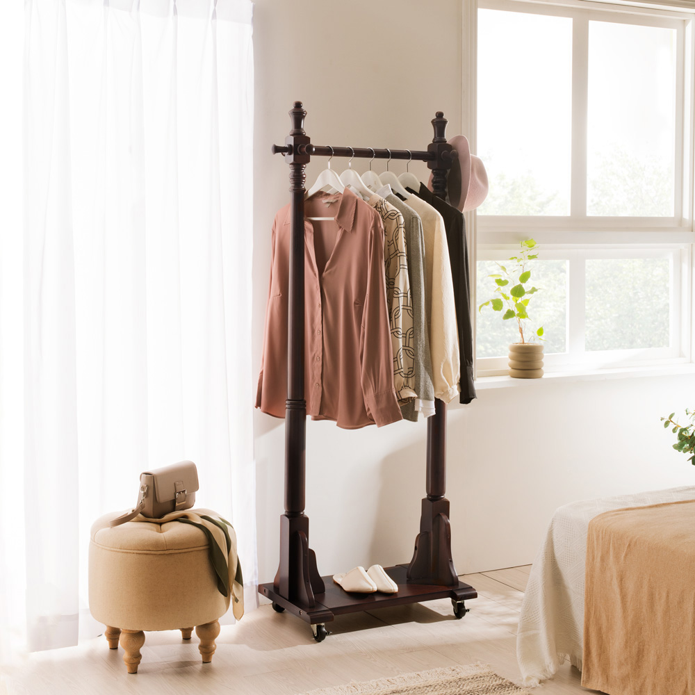 ■マホガニー天然木 キャスター付きハンガーラック 幅73cm奥行40cm高さ168cm 衣類収納 コートハンガー コート掛け 631816