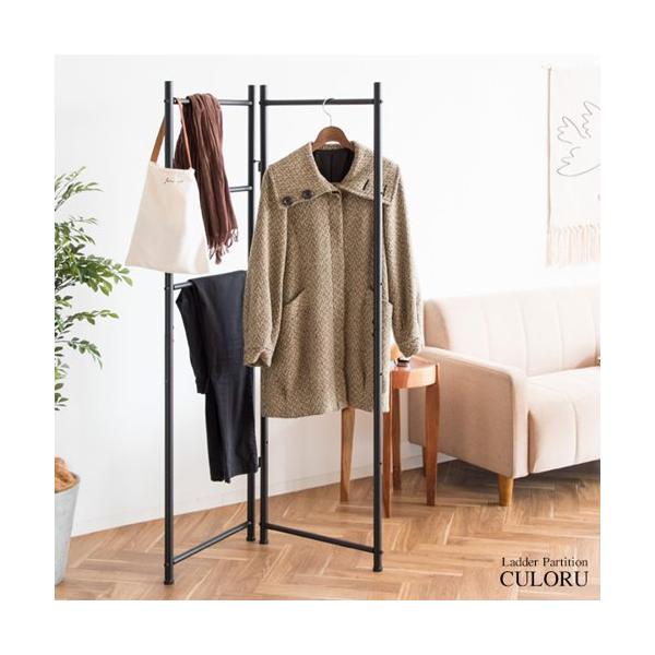 配達業者を指定いただくことはできません。北海道/沖縄/離島のお届けに別途中継料金が発生します。※別途送料が発生する場合は後ほどご連絡させていただきます。ロングコートやワンピースも収まる高さのハンガ―ラックとカバンやストールなどを掛けられるラダーラックが一つになった便利なラダーパーテーション『CULORU(クロル)』。バーの位置は4段階でお好みの位置に取り付けられるのでボトムやカバンなどお気に入りを魅せながら収納できます。パーテーションタイプで使わないときは折りたたんでスリムに収納できるので来客時のコートハンガーや室内物干しにも最適。カラーはシックなブラックと落ち着きのあるライトグレーの2カラーをご用意。お家の色々な場所に馴染んで幅広くお使いいただけます。タイミングによっては在庫切れの場合があります。