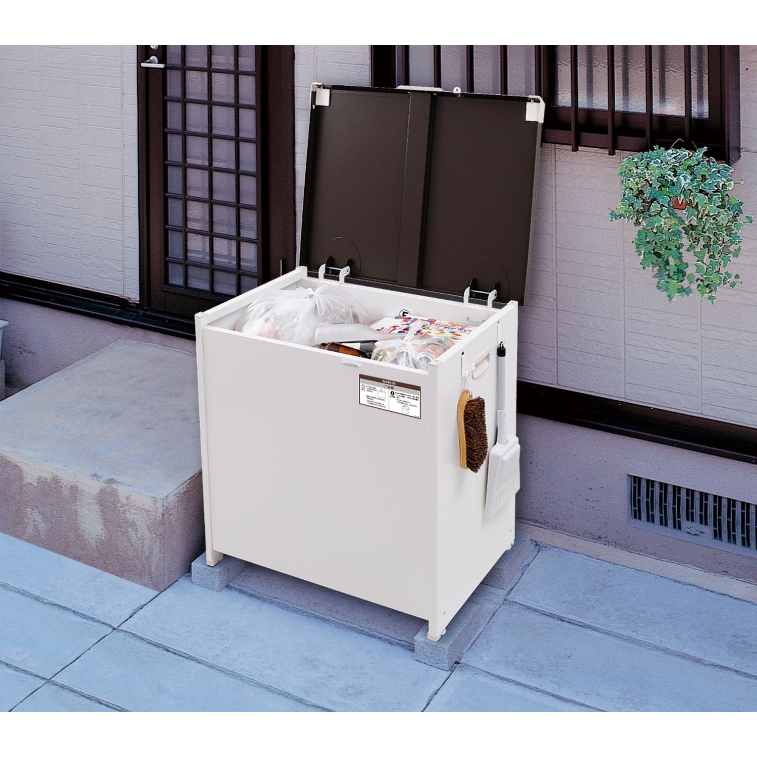 ゴミ、園芸用品、ポリタンク、アウトドア用品など、さまざまなものをマルチに収納できるボックス宅配ボックスとしても使えるので、留守の際や置き配にも便利です丈夫で清潔なスチール製外壁に合ったシックなツートンカラー & シンプルなデザインです南京錠の取り付けフックや、小物を掛けて収納できるフック付き