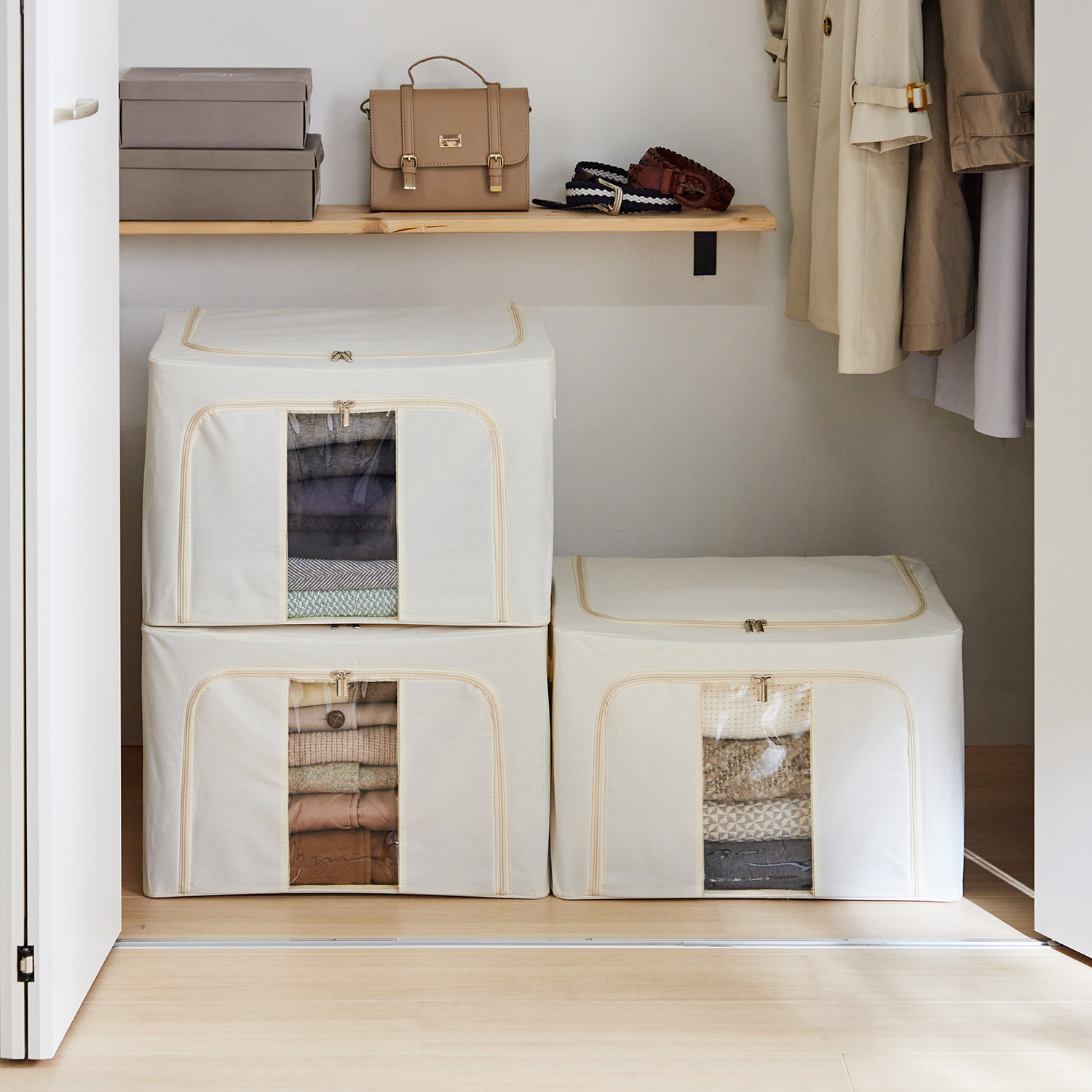 正面に窓が付いているので、中身がすぐに確認可能ワイヤーフレーム設計で積み重ねても型崩れしません前面にもファスナーが付いているので、積み重ねたままでも中身を取り出せます約66リットルの大容量使わないときはたたんでコンパクトに収納【収納の目安】Tシャツ:約60~70枚、バスタオル:30~40枚