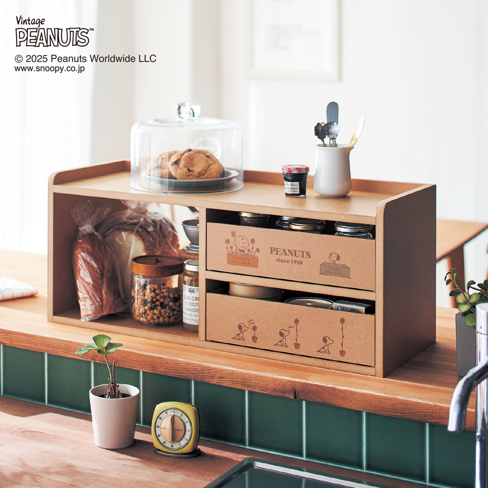 ーデザイン・スタイリングー・カウンター上の調味料やカトラリーなどの収納に便利・引出しの両面には同じ1950年代ながら異なるテイストのスヌーピーがデザイン・キッチンに合うナチュラルな色味ー機能ー・天板は落下を防ぐ立ち上がり付き・引出しは両側から引出せて単体でも使用可能