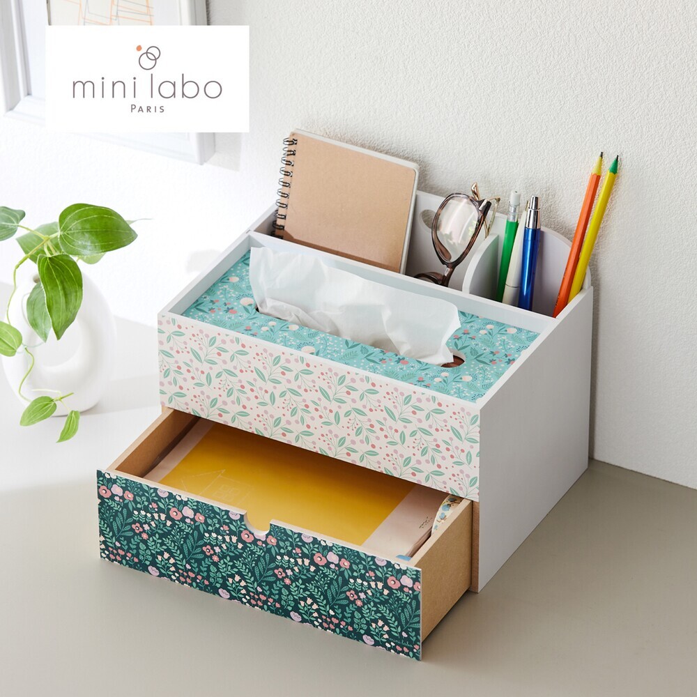 ーデザイン・スタイリングー・デスクの上で散らかりやすい小物を、この収納ボックスにひとまとめ・ハサミやペン、リモコン、眼鏡などこまごましたものを立てて収納でき、出し入れもラク・引出しには文房具類などをまとめておける・ティッシュボックスをそのまま収納でき、フタをすればセットも簡単・ティッシュは紙箱にもビニール入りにも対応・リビングでよく使う小物を収納したり、デスクワークで使う文具類を収納したり、また玄関まわりに置くなど、いろんなシーンで活用OK・おしゃれな小花柄が空間を華やかに彩るミニラボパリのデザイナーが生み出す大人かわいい世界「mini labo(ミニラボ)」は、パリで活躍する2人のクリエイター、キャロリーヌとセリーヌによるクリエイションブランド。 パリの気分が詰まった、華やかで夢のあるミニラボワールドをつくりあげています。
