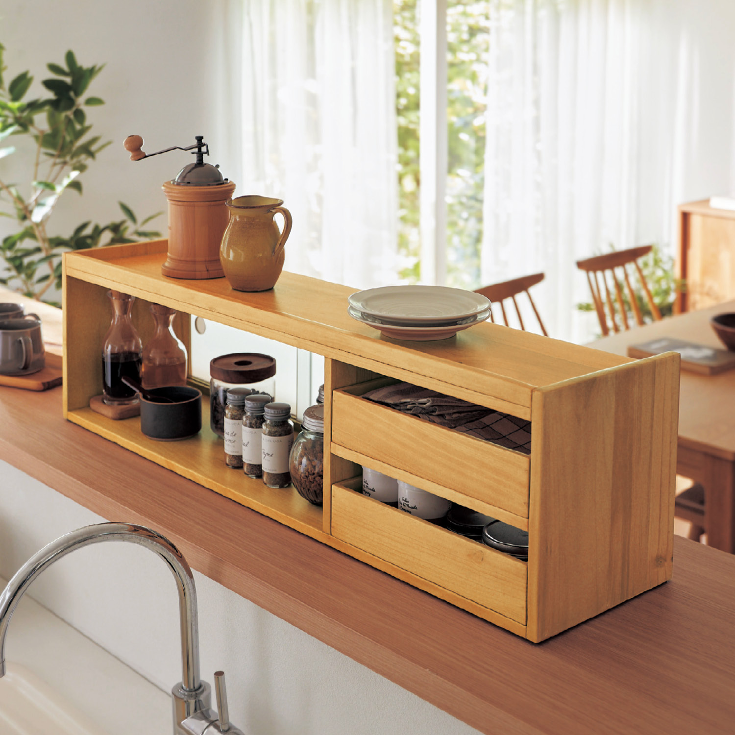 カウンター上を整理整頓できる収納ボックス両側から出し入れでき、片側はミストガラスの引戸でさりげなく目隠しできます2個のトレイは前後どちらからでも出し入れでき、そのまま食卓に持ち出して使っても◎天板は小物が落ちにくいよう立ち上がり付き優しい雰囲気の天然木パイン材を使いインテリア性にもこだわりましたつい置きっぱなしにしがちなカウンター上を整える収納ボックス。トレイは両側から出し入れでき、そのまま出して使えます。片側はミストガラスの引き戸で視線をやんわりカット。天板には落下を防ぐ立ち上がり付き。