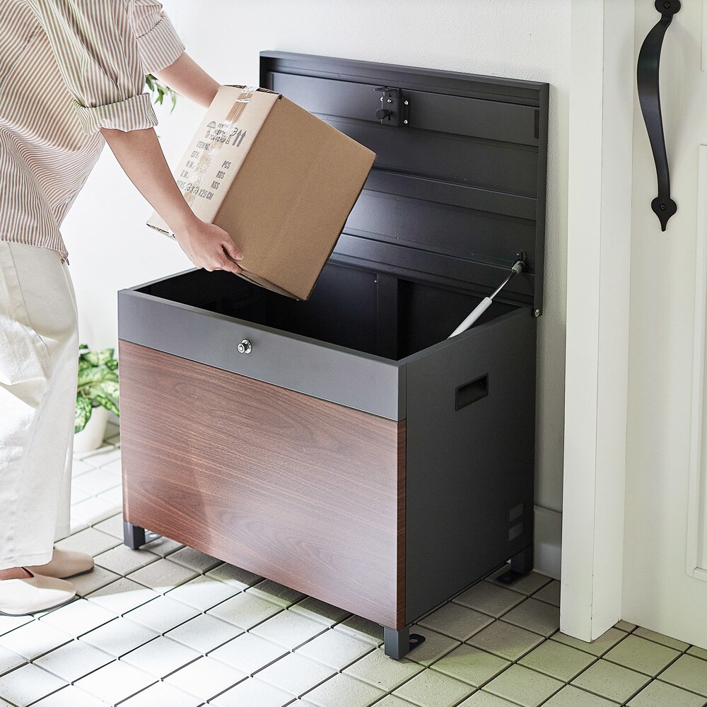 鍵は、鍵の開閉しやすい可能なプッシュキー式スペアキーが1本付属万が一の時には、閉じ込め防止レバー付きで内側からも解錠可能持ち運びしやすい左右側面ハンドル付き商品の左右側面の下部にスリット窓付きで、扉を開けなくても荷物の確認が可能約幅60.4×奥行36.2×高さ43.7cmと大きいので、大きな荷物や同時に複数の荷物の配達が可能宅配ボックスとして以外にも、子供の遊び道具、アウトドア用品、灯油缶、洗車用品、ごみの保管など、多用途にキー、アンカーボルト、キーフック付印鑑ケース、宅配業者用の配達マニュアルが付属商品の正面部は木目調仕上げと、塗装仕上げのバイカラーデザイン「本体」と「脚パーツ」のみをボルトで固定する簡易組立錆びにくいガルバナイズド処理