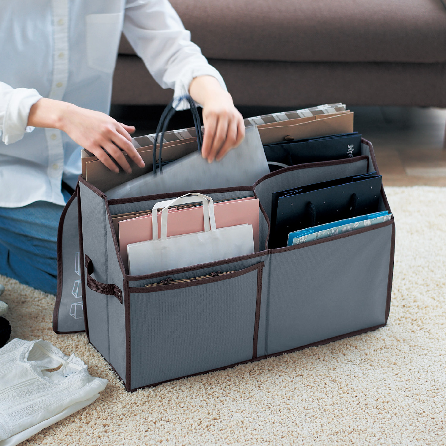 人気の紙袋収納ボックスがリニューアル!背面のパイピングを追加して強度アップ!ついつい増えてしまう紙袋を、専用ボックスに使いやすく収納大きな紙袋が入る深型ポケットと、小さい紙袋も取り出しやすい浅型ポケットが2つ分けておきたいものには、前面ポケットも付いています活性炭シートを内蔵フタ付きなので目隠しやほこり除けもできます奥行約20cmのスリムなので、すき間にもすっきり収納持ち手付きで出し入れも簡単です#色柄デザインいろいろ「ファブリック・合皮・ビニール素材の収納ボックス」タイプ
